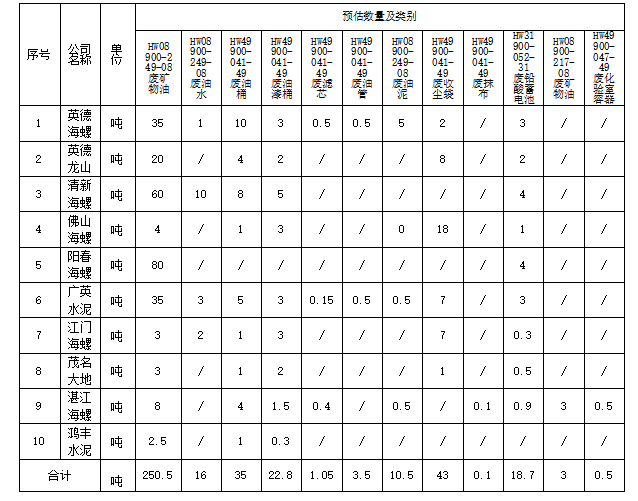 為做好廣東區(qū)域英德海螺水泥有限責任公司(以下簡稱英德海螺)、廣東清新水泥有限公司(以下簡稱清新海螺)、江門海螺水泥有限公司(以下簡稱江門海螺)、湛江海螺水泥有限責任公司(以下簡稱湛江海螺)、佛山海螺水泥有限責任公司(以下簡稱佛山海螺)、茂名市大地水泥有限公司(以下簡稱茂名大地)、陽春海螺水泥有限責任公司(以下簡稱陽春海螺)、廣東清遠廣英水泥有限公司(以下簡稱廣英水泥)、廣東海螺鴻豐水泥有限公司(以下簡稱鴻豐水泥)以及英德龍山水泥有限責任公司(以下簡稱英德龍山)2022-2023年危廢處置工作,防范環(huán)?;轱L(fēng)險,本次由江門海螺牽頭對以上10家公司危廢物資處置進行公開招標,歡迎具備條件的單位參加。現(xiàn)將招標基本信息發(fā)布如下: