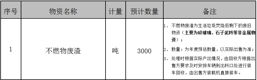2. 不燃物廢渣為生活垃圾焚燒系統(tǒng)焚燒后的廢舊物資,從中標(biāo)日起截止2023年4月14日期間垃圾焚燒所產(chǎn)生的不燃物廢渣,均由中標(biāo)單位根據(jù)招標(biāo)方要求分批次進(jìn)行回收,現(xiàn)場(chǎng)直接裝車(chē)過(guò)磅,所產(chǎn)生的一切費(fèi)用包含在投標(biāo)報(bào)價(jià)內(nèi)。