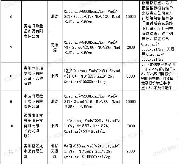 海螺水泥貴州區(qū)域擬對2022年4月21日至2022年5月20日生產(chǎn)用煤炭進行公開招標,選定中標單位,現(xiàn)將相關(guān)招標事宜公示如下: