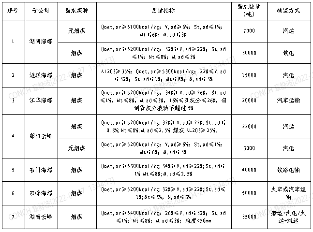 根據(jù)2022年5月21日-2022年6月20日海螺水泥湖南區(qū)域各子公司煤炭需求,現(xiàn)擬對煤炭進行公開招標(biāo),選定中標(biāo)人,為體現(xiàn)公平、公正、公開的原則,拓寬采購渠道,現(xiàn)將招標(biāo)相關(guān)事宜公告如下:
