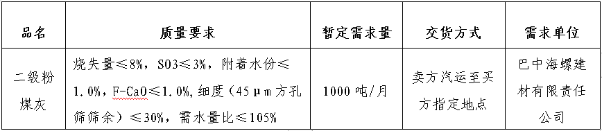 為進一步提升二級粉煤灰采購招標的公平、公正、公開透明性,根據巴中海螺建材二級粉煤灰需求,現組織開展二級粉煤灰公開招標,特將招標事宜公告如下: