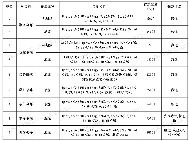 根據2022年6月21日-2022年7月20日海螺水泥湖南區(qū)域各子公司煤炭需求,現擬對煤炭進行公開招標,選定中標人,為體現公平、公正、公開的原則,拓寬采購渠道,現將招標相關事宜公告如下: