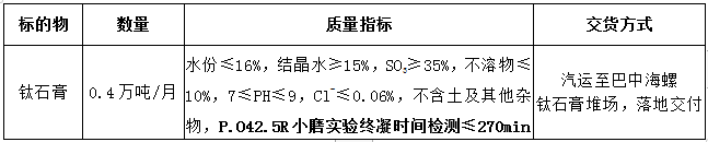 2.報名渠道需提供鈦石膏貨源地證明材料(包括但不限于合同、發(fā)票等),且新渠道需經(jīng)招標人實地調(diào)研取樣化驗合格后方可參與投標,除化學指標外,招標人需要對新渠道鈦石膏凝結(jié)時間進行檢測,要求在PO42.5R小磨實驗中終凝時間不高于270min。