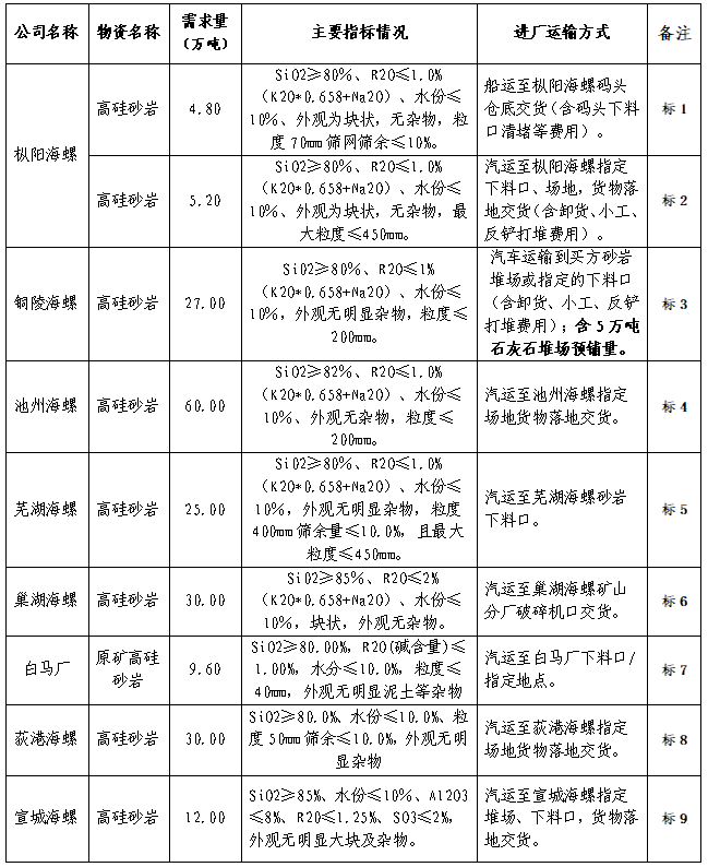 根據(jù)生產(chǎn)需求,本著“公開(kāi)、公平、公正”的原則,擬對(duì)省內(nèi)和皖北區(qū)域部分子公司(白馬山水泥廠、蕪湖海螺、荻港海螺、銅陵海螺、池州海螺、樅陽(yáng)海螺、宣城海螺和巢湖海螺)外購(gòu)砂巖進(jìn)行公開(kāi)招標(biāo),歡迎具備條件的單位參加,現(xiàn)將招標(biāo)相關(guān)事宜公告如下: