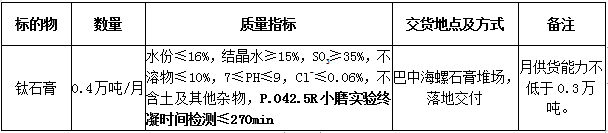 3.投標(biāo)渠道必須為直供渠道或加工型企業(yè),擁有穩(wěn)定的鈦石膏原渣來源(需提供可經(jīng)核實(shí)的相關(guān)包銷協(xié)議、處置協(xié)議,不接受委托書)和固定的加工設(shè)備及必要的堆存場地。新渠道需經(jīng)招標(biāo)人實(shí)地調(diào)研取樣化驗(yàn)合格后方可參與投標(biāo),除化學(xué)指標(biāo)外,招標(biāo)人需要對新渠道鈦石膏凝結(jié)時(shí)間進(jìn)行檢測,要求在PO42.5R小磨實(shí)驗(yàn)中終凝時(shí)間不高于270min。招標(biāo)人有權(quán)對投標(biāo)材料中的真實(shí)性予以進(jìn)一步核實(shí),投標(biāo)渠道須無條件予以配合。